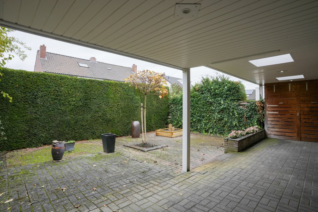Daar wacht een onderhoudsvriendelijke tuin met een prachtige overkapping – de ideale plek voor lange zomeravonden met een goed glas wijn, een barbecue met vrienden of gewoon een rustig moment voor jezelf. Regenbui? Geen probleem. Hier zit je altijd goed, droog én gezellig.